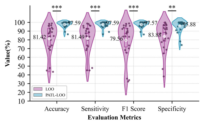 图3. 在CHB-MIT数据集上对跨患者癫痫发作检测的LOO和PATL-LOO交叉验证策略的比较。包括小提琴图、箱线图和散点图,用白点表示均值,用黑数字表示。**表示P<0.01的统计学显著差异,***表示P<0.001。