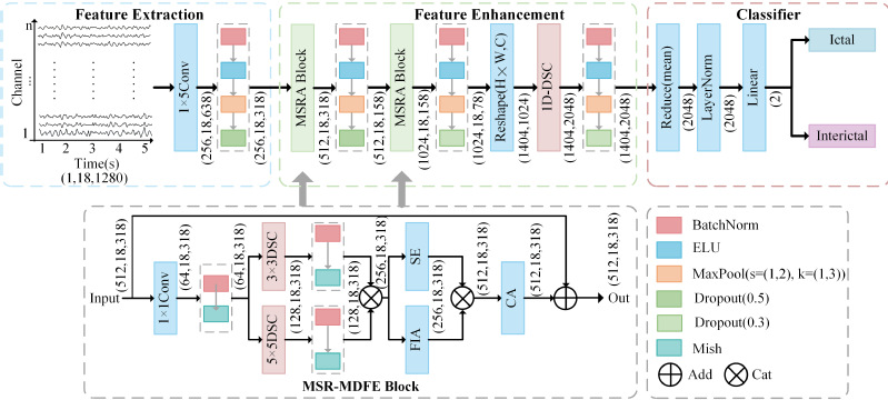 图1. MSR-MDFENet架构图,由特征提取模块、特征增强模块和分类器模块组成。该图中的数据输入格式以CHB-MIT数据集为例为(1, 18, 1280),而JHCH和JHMCHH数据集的输入格式为(1, 12, 1280)。该模型能够自动适应电极数量的变化。