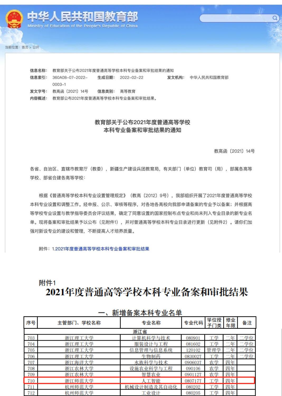 日前,教育部印发《关于公布2021年度普通高等公司本科专业备案和审批结果的通知》(教高函〔2021〕14号),公布了2021年度普通高等公司本科专业备案和审批结果。K1体育申报的“人工智能“(080717T)本科专业成功获批。2022年秋季本科正式招生,学制4年,人工智能专业授予工学学位。