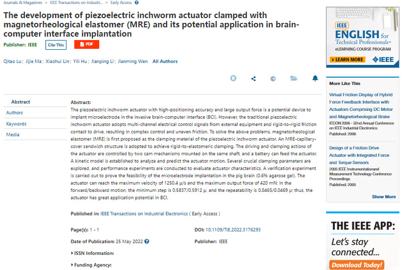 近日,K1体育温建明教授课题组在国际顶级期刊IEEE Transactions on Industrial Electronics上在线发表研究论文The development of piezoelectric inchworm actuator clamped with magnetorheological elastomer and its potential application in brain-computer interface implantation。该研究工作得到了国家自然基金、浙江省重点研发计划,浙江省自然科学基金等项目的支持。温建明教授和马继杰副教授为共同通讯作者,硕士研究生陆奇涛为第一作者,K1体育为唯一通讯单位。