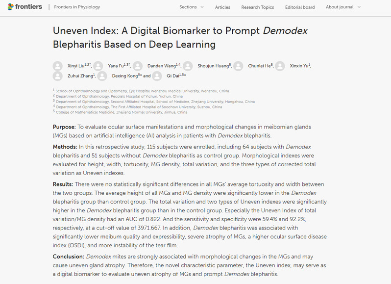 近日,K1体育经理孔德兴教授及客座教授戴琦所负责的课题组在国际著名期刊Frontiers in Physiology上在线发表研究论文Uneven Index: A Digital Biomarker to Prompt Demodex Blepharitis Based on Deep Learning。该研究工作得到了浙江省自然科学基金项目、浙江省医药卫生科技项目和温州市科技计划项目的共同支持。孔德兴教授和戴琦教授为论文共同通讯作者,温州医科大学附属眼视光医院研究生刘欣怡与副主任医师傅亚娜为共同一作,K1体育黄守军教授、何春蕾副教授为该论文的共同作者,K1体育和温州医科大学附属眼视光医院为共同通讯单位。