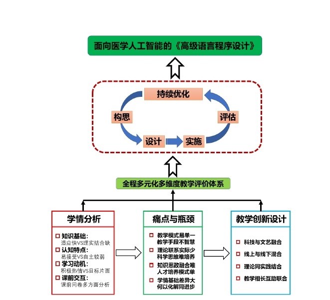 张建峰老师主讲的《面向医学人工智能的高级语言程序设计》旨在帮助员工掌握C语言程序设计知识体系,并具备科研严谨的思维和理实结合、学以致用的能力。在深度剖析课程学情,张老师挖掘课程教学“四大”重点问题后,提出科技与文艺融合、线上与线下混合、理论同实践结合、教学相长互助联合等四大创新设计,并加以全程多元化多维度教学评价体系,最终整体上通过构思、设计、实施、评估、优化五步闭环式循环机制落实面向医学人工智能的课程教学创新设计、教学目标及教学理念。